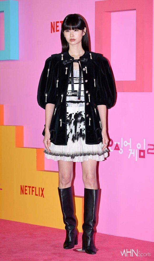 Jung Ho Yeon memikat perhatian publik dengan busana hitam-putihnya di karpet merah muda, menampilkan proporsi sempurna dan fisik bak model.