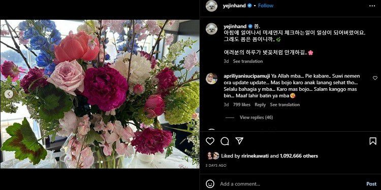 Unggahan Ye Jin ini pun langsung dibanjiri komentar penggemar yang merasa senang karena mendapat kabar terbaru dari sang aktris. Mereka juga tampak bahagia melihat Son Ye Jin mau membagikan rutinitasnya sebagai seorang ibu.