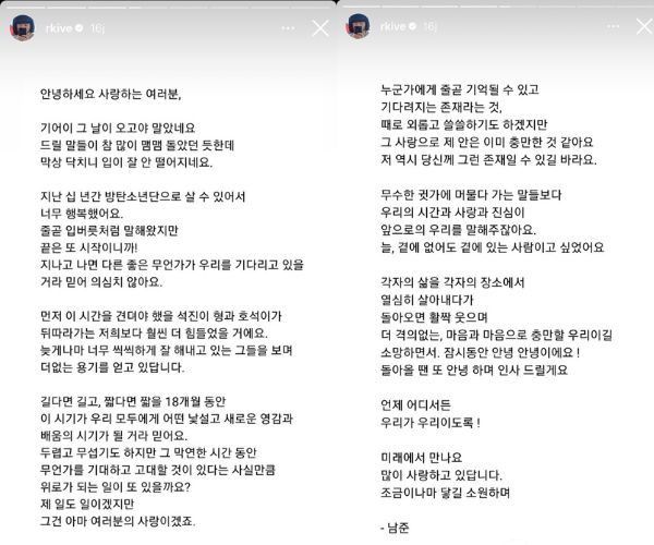 Pada 10 Desember, sehari sebelum wajib militernya, RM melalui Instagram Stories memposting isi surat itu.