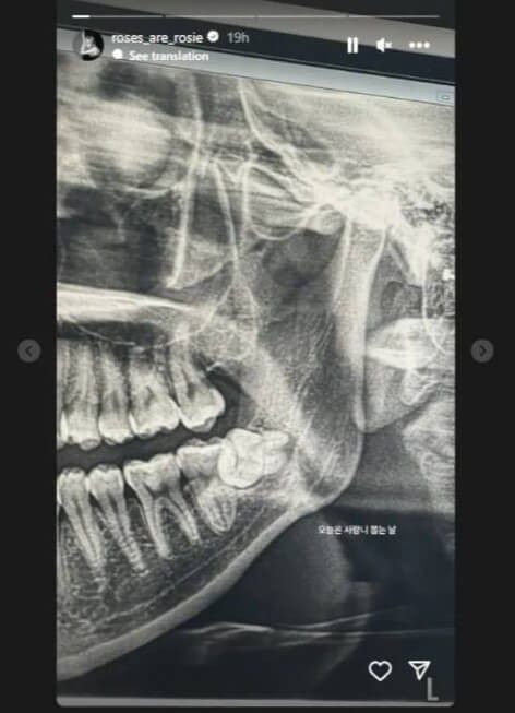 Wanita dengan nama asli Park Chaeyoung memperlihatkan hasil rontgen giginya yang bermasalah. Dari unggahan tersebut, tampak kondisi gigi bungsu Rose tumbuh dalam kondisi miring.