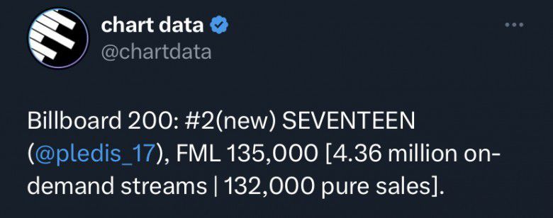 Di posisi No. 2 adalah mini album ke-10 baru SEVENTEEN “FML,” yang menandai peringkat tertinggi grup di Billboard 200, serta entri 10 besar ketiga berturut-turut.