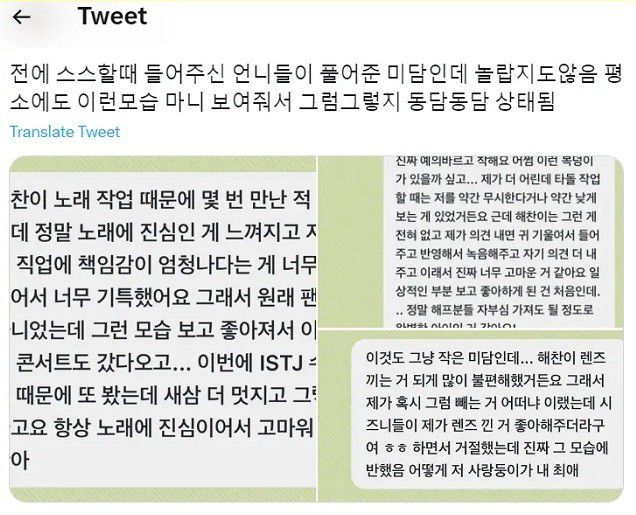 "Dia sangat sopan dan baik. Aku pikir dia adalah orang yang berharga dan membawa berkah. Aku sendiri lebih muda (dari kebanyakan orang yang bekerja sama denganku). Saat aku bekerja dengan idol lain, kadang mereka mengabaikanku dan meremehkanku," ungkap 'A'.