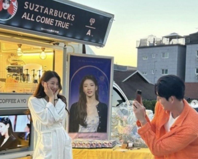 “Energi saya meningkat berkat teh citron madu dan teh susu royal! Terima kasih!" Di foto itu, Suzy tampak berpose manis di depan truk kopi, sembari Kim Woo Bin mengambil gambarnya.