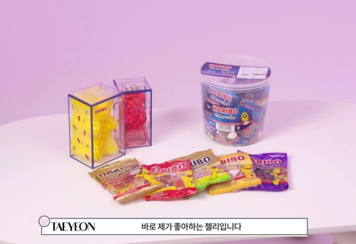 "Saya memilikinya di mobil dan juga di rumah. Dan saya hanya makan di rumah ketika saya melihatnya." Saat ditanya apa camilan favoritnya, Taeyeon menjawab, "Jelly" tanpa ragu-ragu.