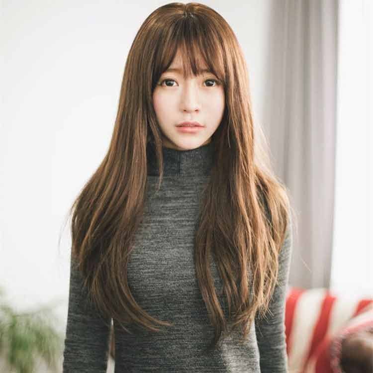 Gaya rambut panjang lurus bervolume dengan poni Korea ini begitu memukau.