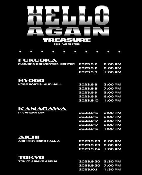 Tampak dalam postingannya, konser bertajuk HELLO AGAIN tersebut ini akan digelar di 5 kota di Jepang yakni Fukuoka, Hyogo, Kanagawa, Aichi dan Tokyo. Total ada 19 show dalam satu bulan yang harus diikuti oleh TREASURE mulai dari 2 September sampai 1 Oktober 2023.