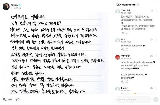 "Halo, ini Sehun. Apa kalian semua baik-baik saja dan sehat? Aku menulis surat ini pada kalian hari ini karena ada sesuatu yang ingin kukatakan pada kalian semua. Aku akan memenuhi tugas militerku mulai tanggal 21 Desember," tulis Sehun EXO.