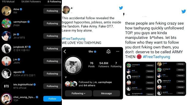 "Masalah follow yang tidak disengaja ini menunjukkan banyak orang-orang munafik, pengangguran, antis terbesar di dalam fandom. ARMY palsu. OT7 palsu. Tinggalkan lelaki aku sendirian. #FreeTaehyung," kometar netizen.