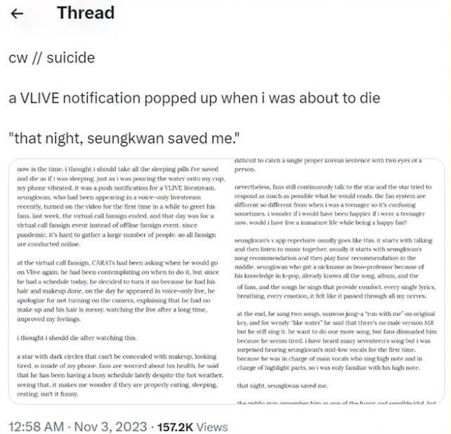 Dalam cerita yang kembali viral di Twitter itu, seorang fans 'A' membagikan cerita pilu pada 15 Agustus 2021. Sehari sebelumnya, A mengaku membatalkan rencana bunuh dirinya setelah menonton siaran langsung Seungkwan SEVENTEEN di VLIVE.