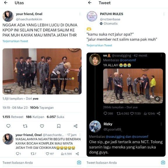 "Nggak ada yang lebih lucu di dunia K-Pop ini selain NCT Dream salim ke Pak Muh kayak mau mintah jatah THR," komentar netizen. "Kamu suka NCT jalur apa? Jalur member NCT salim sama Pak Muh," sambung netizen. "Oke sip. Gw jadi tertarik NCT ama NCT. Tolong saranin lagu mereka yang kalian suka dong guys," timpal netizen lain.