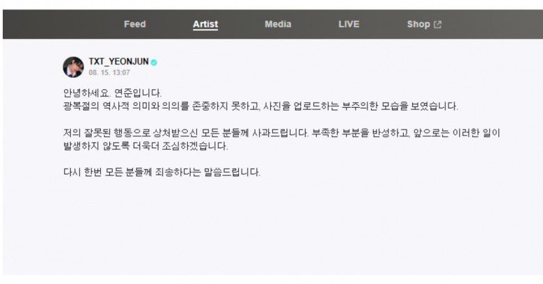 Yeonjun TXT minta maaf karena telah memposting foto-foto liburannya di Jepang di Instagram pada Hari Pembebasan Nasional Korea. Sadar telah membuat kesalahan, foto tersebut kemudian dihapus.