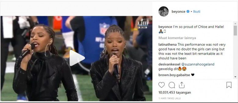 Beyonce lantas membagikan klip pendek dari duo yang dinominasikan dalam Grammy tahun ini. Dalam unggahan tersebut Queen Bey menulis keterangan: "Saya sangat bangga dengan Chloe dan Halle." Chloe X Halle tampil selama Super Bowl LIII Pregame di Stadion Mercedes-Benz pada 3 Februari 2019 di Atlanta.