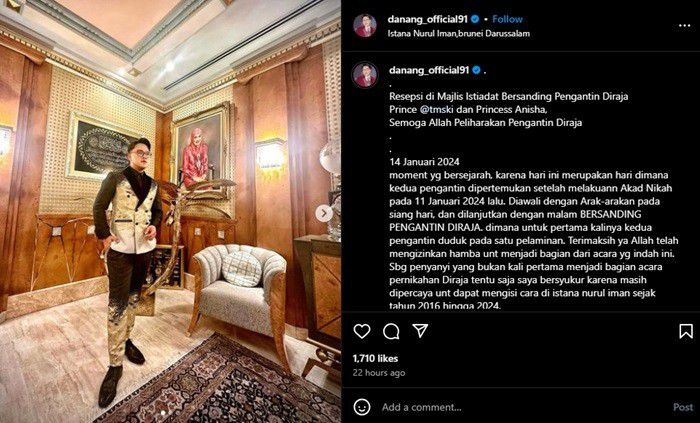 "Terimaksih ya Allah telah mengizinkan hamba unt menjadi bagian dari acara yg indah ini. Sbg penyanyi yang bukan kali pertama menjadi bagian acara pernikahan Diraja tentu saja saya bersyukur karena masih dipercaya unt dapat mengisi cara di istana nurul iman sejak tahun 2016 hingga 2024," pungkas Danang DA.