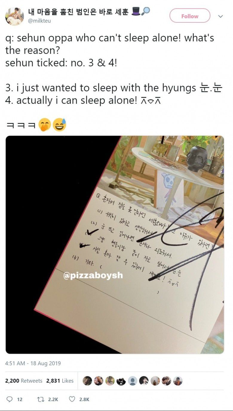 Jadi, suatu kali ada penggemar yang menanyakan hal ini langsung kepada Sehun. Pertanyaan dari penggemar itu dilengkapi dengan sejumlah pilihan. Mulai dari apa dia takut hantu? Atau cuma karena ingin dekat dengan personel lainnya aja?