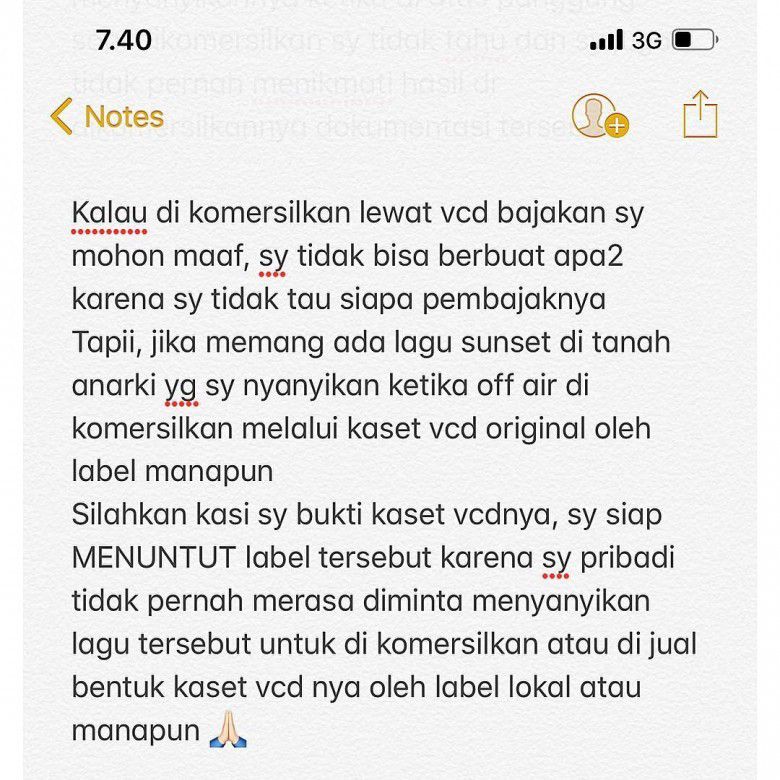 "OK 2013, lagu Sunset di Tanah Anarki kami ikhlaskan, mindset kami saat itu cukup naif; anggap saja membantu struggling musician. Sampai dia bikin DVD segala, dikomersilkan, rapopo," kata Jerinx dalam akun Instagram-nya @jrxsid.