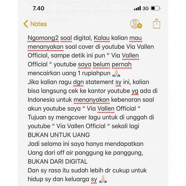 Bersamaan dengan pernyataan itu, Vallen pun mempersilakan publik mengecek langsung kebenaran pernyataannya ke kantor perwakilan YouTube di Indonesia.