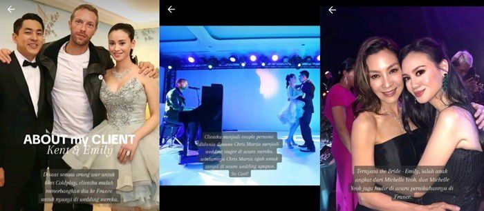 "Clientku menjadi couple pertama di dunia di mana Chris Martin menjadi wedding singer di acara mereka, sebelumnya Chris Martin ogah tampil di acara wedding apapun. So cool!" sambungnya dalam postingannya.