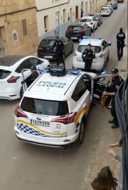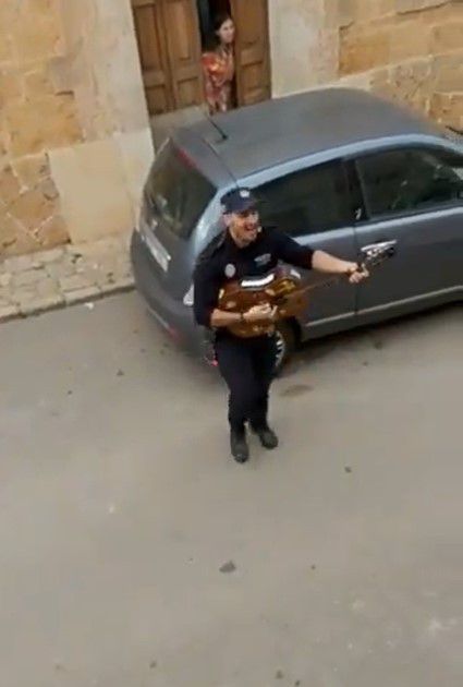 Rombongan polisi Spanyol ini membawakan lagu anak-anak populer Mallorca, 'En Joan petit quan balla'. Mereka juga bertepuk tangan, demikian para warga yang menonton mereka. Seketika, suasana hening langsung berubah hepi.