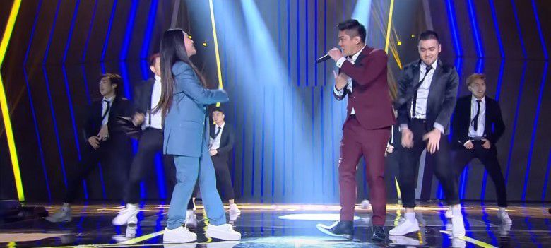 Via tampil menggunakan setelan jas biru laut. Dibelakangnya puluhan dancer memenuhi panggung. Cahaya lampu menyorot gembira dipenampilannya.