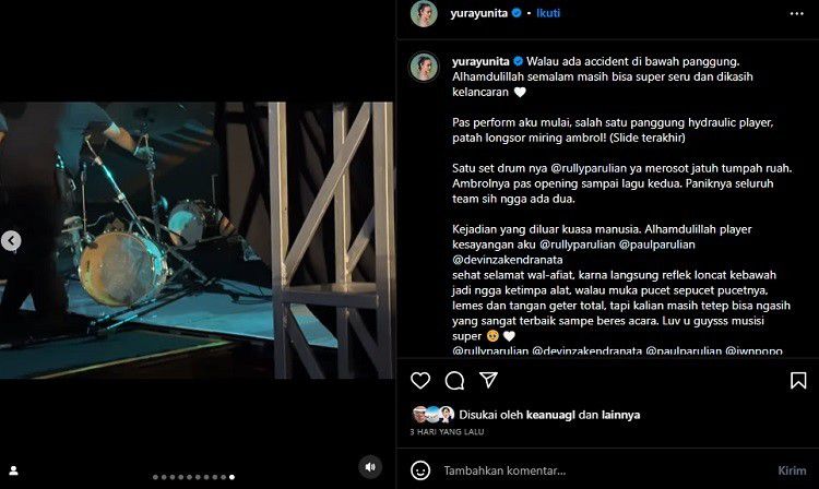 "Pas perform aku mulai, salah satu panggung hydraulic player, patah longsor miring ambrol! (Slide terakhir). Satu set drum nya @rullyparulian ya merosot jatuh tumpah ruah. Ambrolnya pas opening sampai lagu kedua. Paniknya seluruh team sih ngga ada dua," terang Yura.