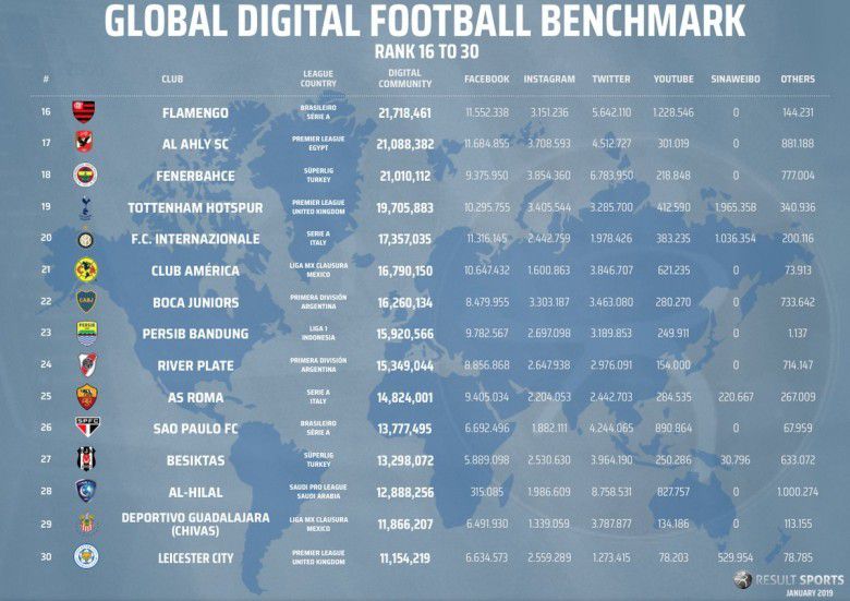 Hasil tersebut diperoleh dari lembaga penghimpun data asal Jerman yang bekerja menyoroti kegunaan media sosial di dunia olahraga. Dilansir dari RESULT Sports lewat Global Football Digital Benchmark via Bolasport.com, merilis data popularitas klub sepak bola di berbagai platform media sosial pada Januari 2019.