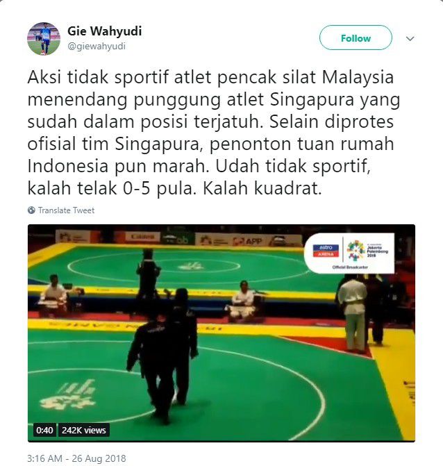 "Dan yang dilakukan pesilat Malaysia itu adalah tendangan yang sangat tidak dibenarkan. Karena pada body protect khusus pada daerah punggung itu tidak ada pengamannya. Semoga pesilat Singapura tersebut tidak mengalami cidera yang serius," lanjutnya dalam cuitan Twitter.