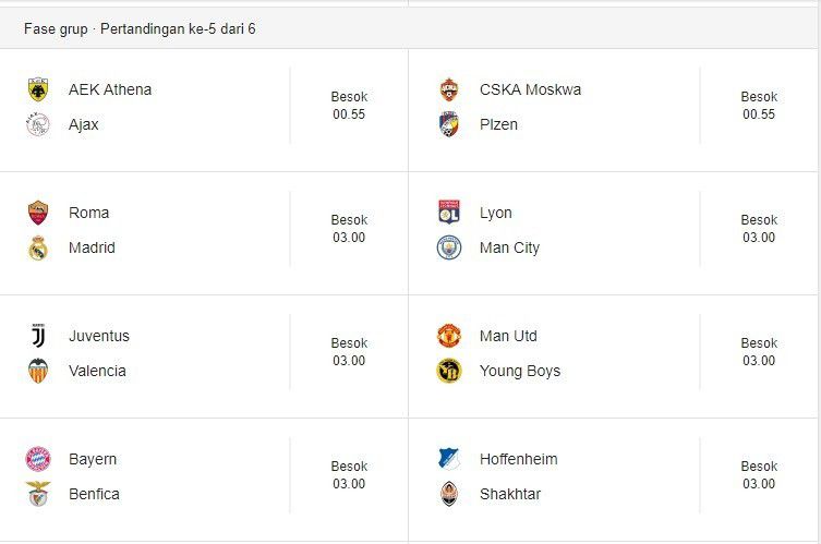 Kemudian pertarungan tak kalah seru akan tersaji pada grup G, saat tuan ruma As Roma akan menjamu sang juara bertahan ajang ini yakni Real Madrid. AS Roma vs Real Madrid pada pukul 03.00 WIB dan CSKA Moskwa vs Plzen pada pukul 00.55 WIB.