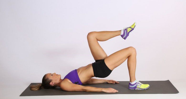 Gerakan ini dilakukan dengan posisi telentang di ranjang. Kemudian tekuk lutut, kaki menapak serta kedua tangan di sisi tubuh. Perlahan, angkat bokong sampai tubuh berada segaris diagonal lurus dengan tubuh. Tekan tumit dengan kuat ke arah ranjang sambil mengangkat satu kaki, dekatkan lutut ke arah dada. Lakukan gerakan yang sama di kaki yang lain secara bergantian. Pastikan juga kamu mengencangkan perut, paha dan bokong untuk melindungi area tulang belakang. Lakukan sebanyak 20 kali. Selain mengecilkan paha, olahraga ini juga bisa menguatkan otot bokong, kaki dan perut.