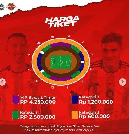 Setelah tahu cara beli tiket Indonesia lawan Argentina, masyarakat harus mengetahui berapa harga tiket yang dijual. Untuk harga tiket Indonesia lawan Argentina adalah Kategori 3 Rp 600.000, Kategori 2 : Rp 1.200.000, Kategori 1: Rp 2.500.000, VIP Barat dan VIP Timur: Rp 4.250.000. PSSI pun sudah menghitung harga tiket sesuai dengan kemampuan masyarakat sepak bola di Indonesia.