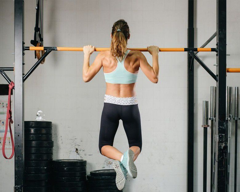 - Posisi badan berdiri di bawah chin up bar dan angkat kedua lengan ke atas untuk memegang palang. Mngkin bisa melompat untuk mencapai bar.