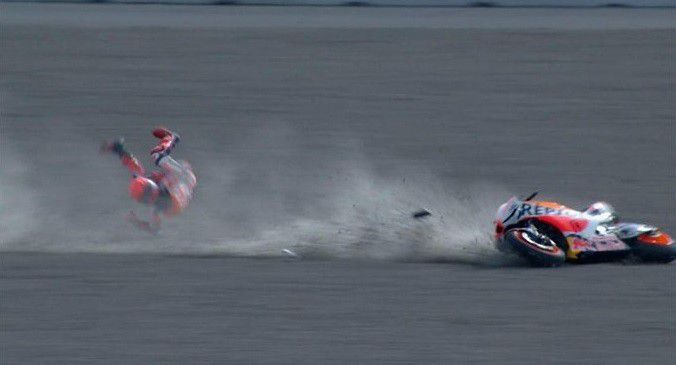 Dalam kecelakaan tersebut, Marquez terlempar jauh dari motor ketika ia sedang berada di tikungan tujuh. Akibatnya, kepalanya mengalami gegar otak ringan karena benturan keras dengan aspal.