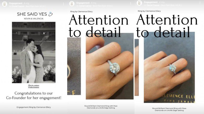“Sesuai dugaan dia beli di tokonya Ci Valen sendiri itu ada di Clemence Ellery. Ini detailnya sekitar 3 carat, kalau dilihat dari volumenya dia lebih tebal jadi kayak lebih tinggi. Makanya kayak agak kopong pas dipake Ci Valen sendiri,” ujar pemilik akun dengan menyertakan foto lamaran Kevin dan Valen di akun Instagram Clemence Ellery.