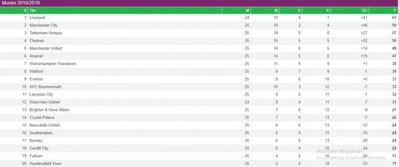 Berikut klasemen sementara Liga Inggris hingga pekan ke-25: