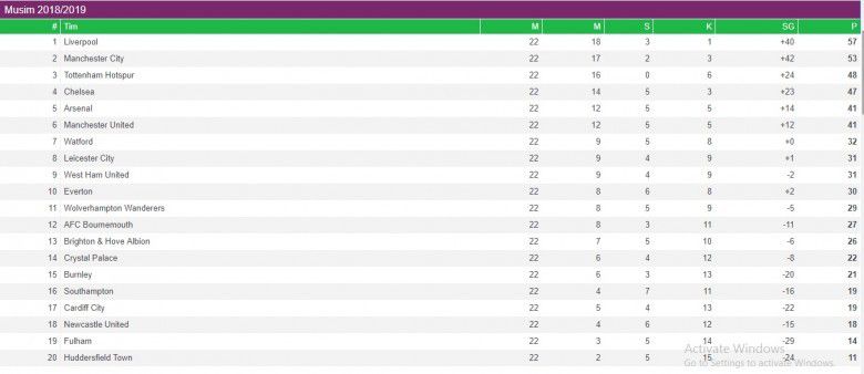 Adapun klasmen sementara Liga Inggris, Liverpool masih berada dipuncak dengan perolehan poin 57, sedangkan Manchester City masih membuntuti di peringkat kedua dengan raihan poin 53.