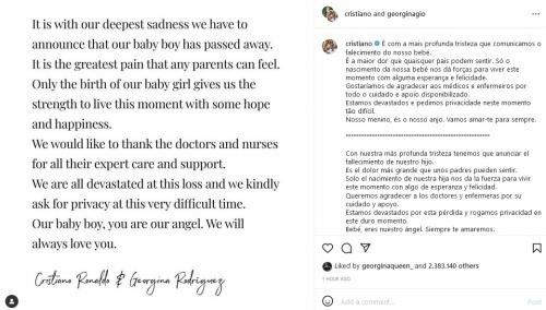 Ronaldo dan Rodríguez juga menambahkan bahwa mereka "hancur" dan membutuhkan privasi pada "waktu yang sangat sulit" ini.