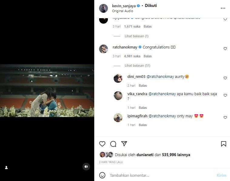 Postingan itu ramai dikomentari netizen maupun rekan sesama publik figur. Tapi dari 17 ribu komentar lebih, ada satu komentar yang mencuri perhatian yakni yang disampaikan oleh pebulutangkis cantik Thailand, Ratchanok Intanon. Atlet yang akrab disapa May itu terlihat ikut memberikan ucapan selamat.