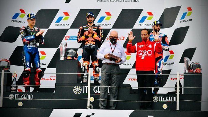 Presiden Joko Widodo memberikan trofi kepada ketiga pembalap tersebut. Ada hal berbeda saat prosesi perayaan Oliviera jadi juara karena setelah pemberian piala, biasanya langsung dilakukan perayaan dengan menyemprotkan sampanye di atas podium. Di Mandalika hal itu tidak terjadi.
