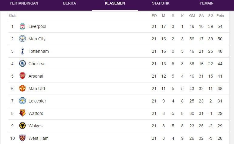 Klasemen sementara 10 besar Liga Inggris (screnshoot @google.co.id)