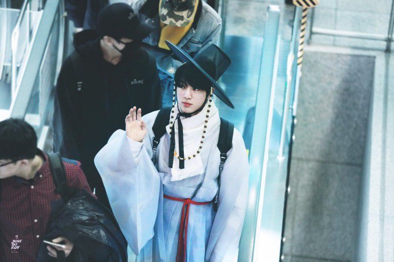 Jin BTS memakai Hanbok di bandara (wow.tribunnews.com)
