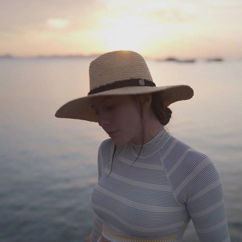 OOTD ke pantai ala Wulan Guritno yang pertama aja sudah kece banget nih. Ibu dari tiga orang anak tersebut mengenakan bodycon crop top longsleeve warna abu-abu motif garis-garis putih. Penampilannya makin kece dengan topi rotan pantai. Latar sunset membuat fotonya terlihat makin estetik. Duh, gemes banget!