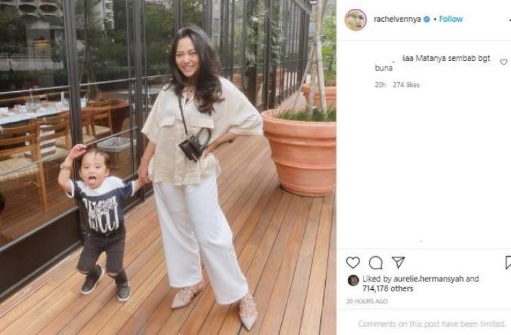 Kali in bersama anak pertamanya, Xabiru. Rachel Vennya tampak modis dengan gaya simpel kemeja krem dan celana kulot putih. Rambutnya terurai alami bikin tambah cakep ih!