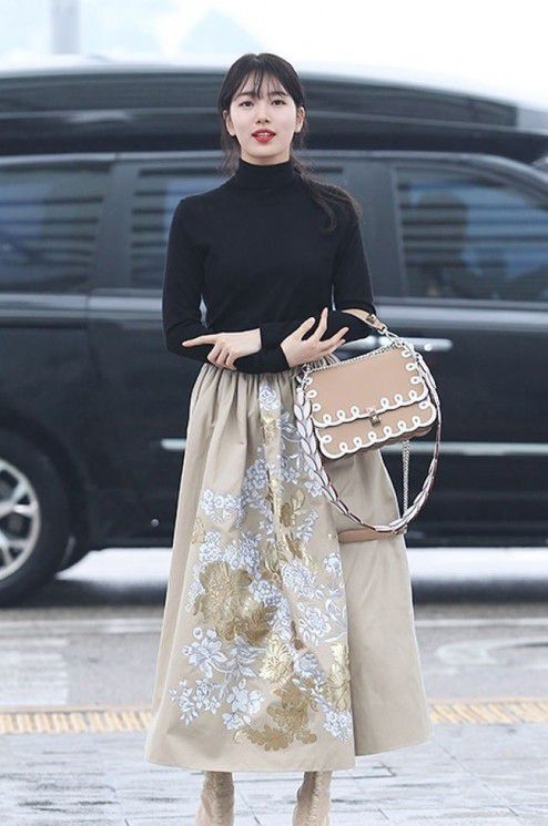 1. Turtle neck hitam dengan rok panjang, sepatu boot, dan tas dengan warna nude senada. Bikin doi tampak anggun banget ya ges. Warna lipstik merah nyala menyempurnakan kecantikannya.