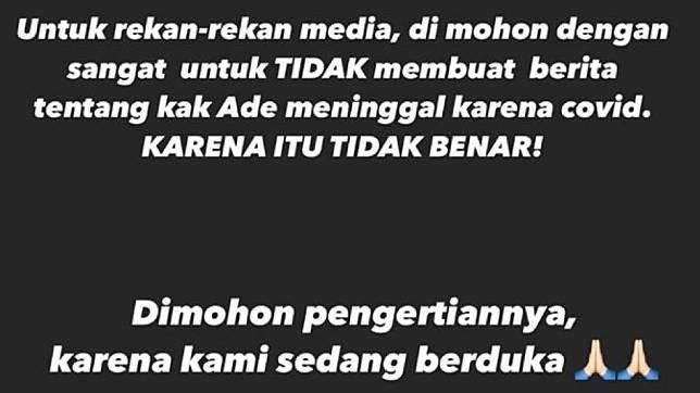 "Untuk teman-teman media, di mohon dengan sangat untuk TIDAK membuat berita tentang kak Ade meninggal karena covid, KARENA ITU TIDAK BENAR!," tulis Kiky lewat unggahan Instagram Storiesnya, seperti dikutip Selasa (15/9/2020).
