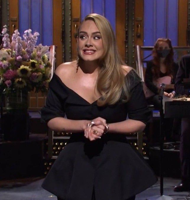 Dengan gaun pendek dan high heels berwarna hitam, Adele terlihat begitu elegan. Busananya itu pun semakin menonjolkan sisi-sisi tubuhnya yang tampak langsing.