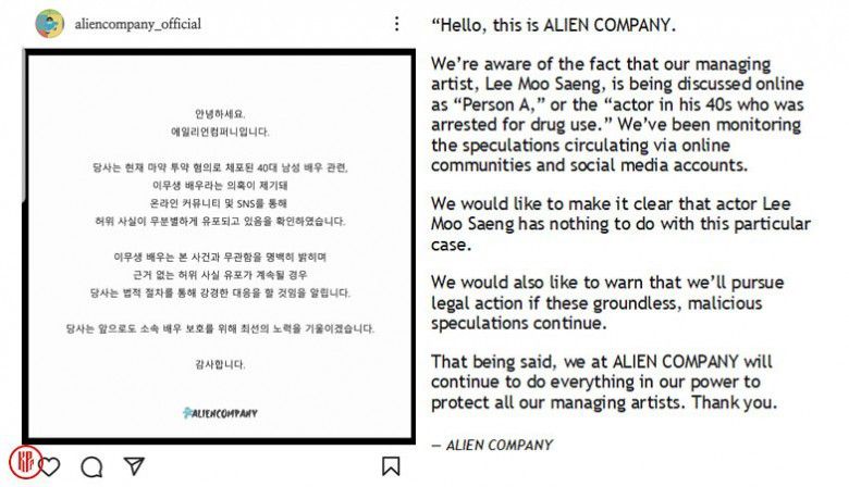 Kami ingin memperjelas bahwa aktor Lee Moo Saeng tidak ada hubungannya dengan kasus khusus ini. Kami juga ingin memperingatkan bahwa kami akan mengambil tindakan hukum jika spekulasi yang tidak berdasar dan jahat ini berlanjut.