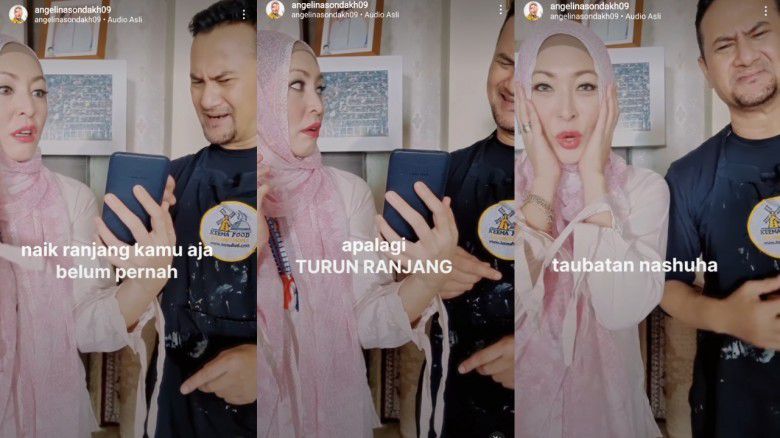 “Turun ranjang bukan itu maksudnya,” kata Angie sambil memberikan lirikan tajam. “Ya Allah maksudnya apa? Aduh, bahasa Belanda dong,” sahut Mudjie. “Taubatan nasuha, taubatan nasuha,” tandas Angelina Sondakh sambil memegang dua pipinya.
