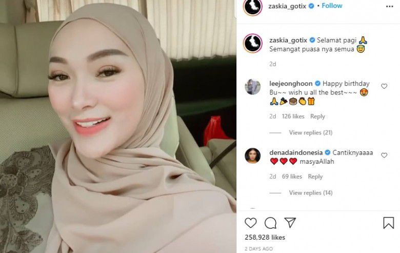 Zaskia memberikan semangat kepada followers-nya dalam menjalani ibadah puasa. "Selamat pagi. Semangat puasa nya semua," tulis istri Sirajuddin Mahmud tersebut. Banyak rekan sesama artis yang memberikan pujian kepada Zaskia.
