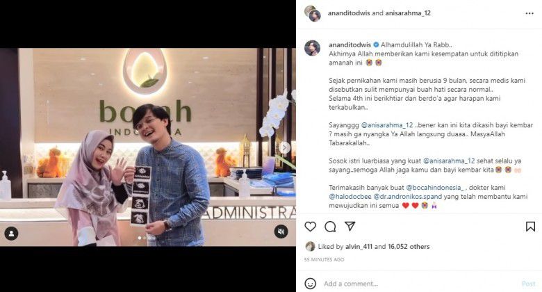 “Sayanggg @anisarahma_12. Bener kan ini kita dikasih bayi kembar? masih ga nyangka Ya Allah langsung duaaa. MasyaAllah Tabarakallah. Sosok istri luarbiasa yang kuat @anisarahma_12 sehat selalu ya sayang. Semoga Allah jaga kamu dan bayi kembar kita,” tandas Anandito Dwis.