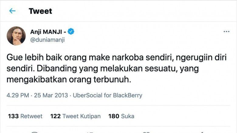 Cuitan lama Anji itu tak lain adalah tentang dia yang membandingkan antara pemakai narkoba untuk diri sendiri dengan kelakuan seseorang yang bisa meghilangkan nyawa seseorang. Tweet Anji tentang perbandingan tersebut di posting pada 25 Maret 2013.