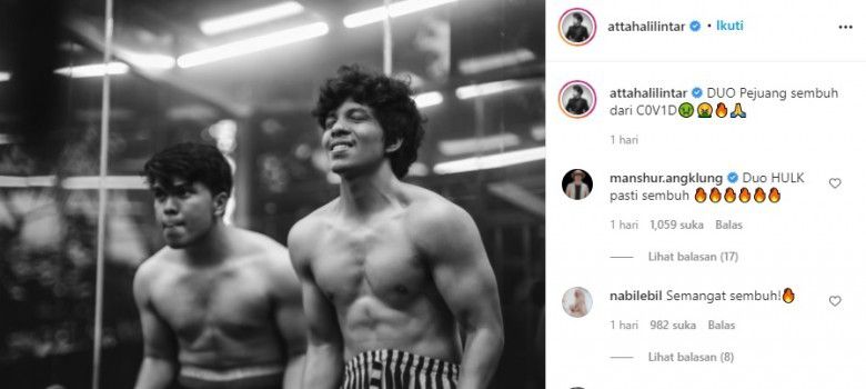 "DUO PEJUANG SEMBUH DARI C0V1D," tulis Atta. Dalam foto itu terlihat Atta dan Thariq tengah melakukan olahraga bersama, Atta mengangkat berbel sementara Thariq angkat besi. Kakak beradik ini dikenal kompak dan sering aktivitas bersama.